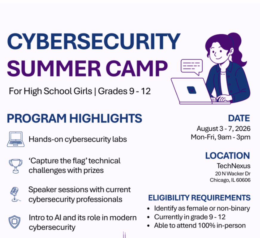 The Chicago Cybersecurity Camp is a free, week-long intensive experience where students explore the exciting world of cybersecurity. Through hands-on labs, technical challenges, and interactive sessions, students learn how hackers think, how systems are protected, and how cybersecurity professionals keep digital systems safe. Students will also hear from industry experts, visit technology offices, and work on fun capture-the-flag style challenges with prizes.